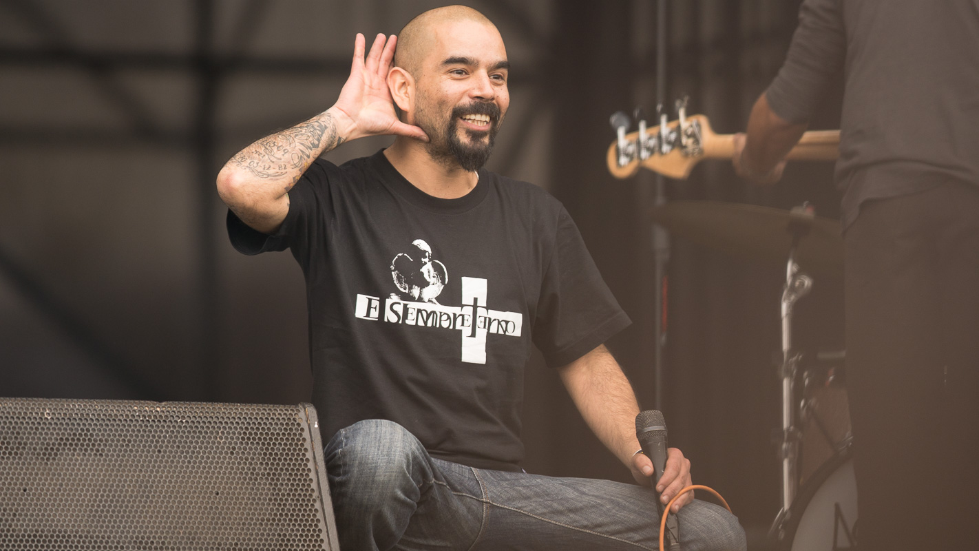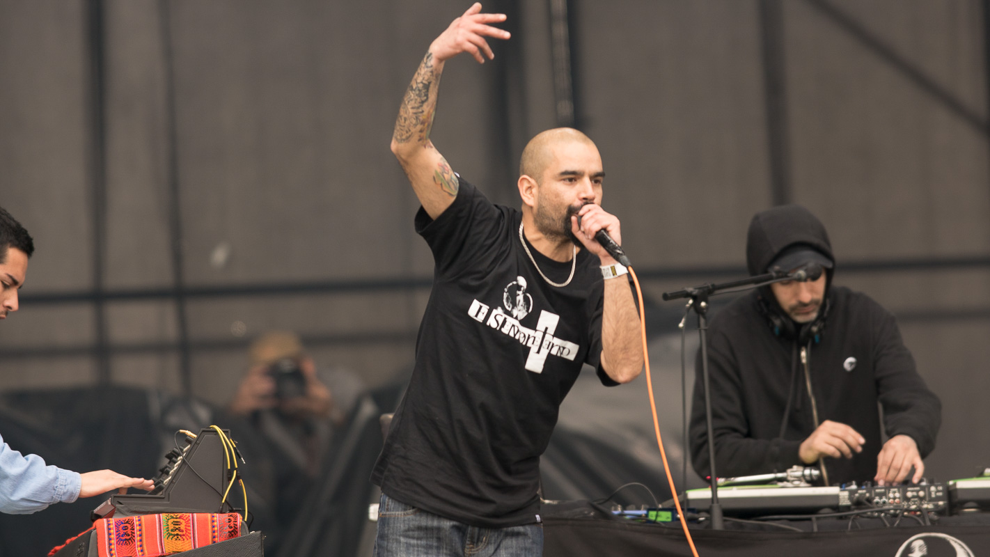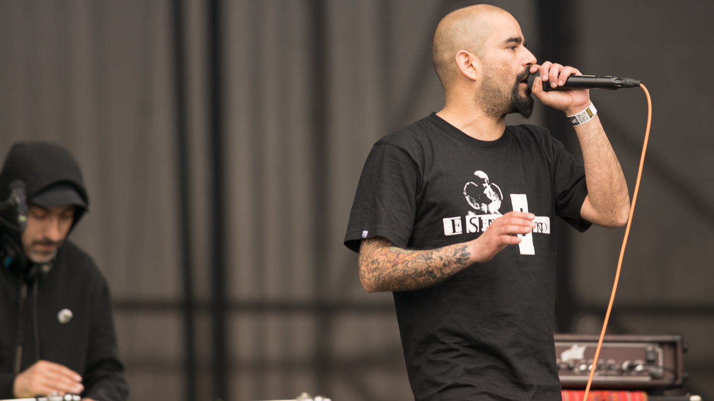 La banda de Hip Hop Fusión nacional, “Cómo asesinar a Felipes”, se presentó en el escenario Escudo Stage 2 a eso de las 13.15 horas del domingo premunidos de la artillería pesada de las rimas crispadas y corrosivas que dispara su siempre locuaz frontman y líder, “Koala” Conteras.